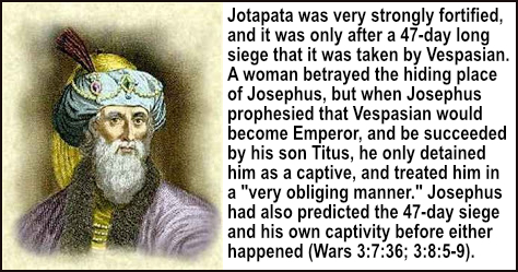 God gave the Jews a generation of 40 years to repent from A.D. 26-27 to 66-67, 31 A.D. to 70 A.D. and 34 to 73 A.D. Herod's Temple was destroyed on 9 Av (August 4, 70 CE on the Julian calendar) by the Romans. The Babylonian Talmud records that for 40 years before the Temple was destroyed, the following events occurred: The lots for the Yom Kippur goats ceased to be supernaturally determined; the crimson thread tied to the Azazel goat's horn (which had before supernaturally turned white to show God's forgiveness) remained red; the western candle in the menorah in the Temple sanctuary would not burn continually; and the doors of the Temple would open by themselves (Yoma 39b). The gospel was preached to every man and woman of Judah in all the earth (Rom. 10:18). His sacrifice made obsolete all the Temple sacrifices. In the last week of September and in the first week of October of 66-67 A.D., the Roman army under Cestius reached and surrounded Jerusalem exactly 40 years from the time Jesus public ministry had begun in Judea in 27 A.D. "Forty years long was I grieved with this generation" (Ps. 95:10; cp. Heb. 3:30). On Passover the Jews put Jesus to death. Forty years later on Passover, Titus put an immense number of Jews to death inside Jerusalem in a siege. Just as they sold Jesus as a slave for 30 pieces of silver (Zech. 11:12; Matt. 26:15), so also the Jews were sold as slaves for the lowest price possible. Just as Jesus was crucified outside the walls of Jerusalem, so also the Jews were crucified in such numbers that "room was wanting for the crosses, and crosses wanting for the bodies" (Wars of Jews 5:11:1). They preferred the robber and murderer Barabbas, so forty years later they got the Sicarii who robbed and murdered men openly in the streets of Jerusalem (Wars of Jews 2:13:3,6). Remember that the Jews had uttered, "His blood be on us and on our children". Another interesting parallel involves the 65 years mentioned till the fall of Israel (Isa. 7:8) in 721 BC which nicely corresponds to the 65 years from the destruction of Jerusalem by Titus in 70 AD till the destruction of Jerusalem by Hadrian in 135 AD. Furthermore, Ezekiel 4:6 mentions "the bearing of the iniquity of the house of Judah" for 40 years. From the crucifixion at Passover 31 AD till the Roman armies under Titus arrive and camp before Jerusalem at the Passover (Josephus Wars 5:13:7) in 70 AD is 40 years.