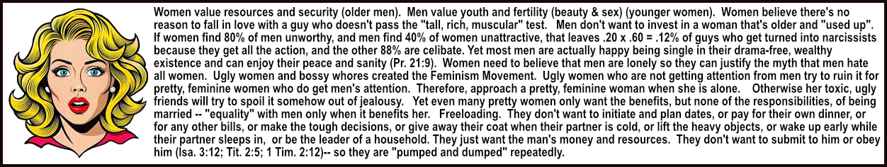 Women blame men for "sexual harrassment" and rape (and well they should), but many of these same women demand freedom from "oppressive, out-dated, dress codes" including VEILS. They don't understand the connection between the way they dress and the way men respond. VEILS are meant to protect them, not restrict them. Women should dress modestly. Men fall in love (or lust) through the eye. Christ said, "whosoever looketh on a woman (wife) to lust after her hath committed adultery with her already in his heart" (Matt.5:28). You can't commit adultery with a single woman. In both Hebrew and Greek, there are not two separate words to distinguish between married women and unmarried women. Both are "GUNE" in Greek. Context is the only way to determine which is meant. Sex with an unmarried woman is fornication -- not adultery. It is proper and necessary for a man to lust after the woman he intends to marry -- that is the main reason most men marry (sex). Lusting in one's heart is not a sin but a necessity for any romance or marriage. The command is only "Thou shalt not covet thy neighbor's WIFE" (Ex.20:17). We must flee immorality (1 Cor.6:18). Christian women must "adorn themselves in modest apparel, with shamefacedness and sobriety" (1 Tim.2:9).