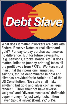 Gold and Silver Receipts But a problem arose: Where do you store your gold and silver to protect it from thieves? In a bank. The bank then issued depositors a receipt or note telling them that they had a quantity of gold or silver in the bank vault. It was a paper IOU that could be redeemed for something of value (called a Silver Certificate or a Gold Certificate). Today these IOUs are called "Federal Reserve Notes" -- not "Silver Certificates" or "Gold Certificates." The "Federal" Reserve Bank is not part of the federal government. It is a private bank that UNCONSTITUTIONALLY prints America's money. The U.S. Treasury should create our money according to our Constitution. Article 1:8 says "Congress shall have power to coin money and regulate the value thereof." In the past, "Federal Reserve Notes" were redeemable in gold or silver, but those words were taken off the bills. This is also UNCONSTITUTIONAL. Article 1:10 says "Nothing but gold and silver" shall be used for money. Why? It can't be inflated, like paper currency. Coins should be made of silver or gold, but now are just base-metal tokens. Tokens can be inflated. "Paper money is theft" -- George Washington. "There is no legal tender ... in this country ... but gold and silver" -- Daniel Webster. "Thy silver is become dross, thy wine mixed with water" (Isa. 1:22). Leviticus 19:35-37 says, “You shall do no wrong in judgment, in measures of length or weight or quantity. You shall have just balances, just weights, a just ephah, and a just hin: I am the Lord your God, who brought you out of the land of Egypt. And you shall observe all my statutes and all my ordinances, and do them: I am the Lord." How Banks Steal From Us But as banks collected all the gold and silver in the community, they discovered that only a few depositors at any one time came to withdraw their bullion. Therefore, the banks could safely lend out 90% of their depositor's gold and silver and make money by doing so, provided there was no run on the bank. Thus, a bank is allowed to create out of thin air nine times the amount of money it holds in reserve. This Fractional Reserve Banking actually lends money into existence thereby making each note already in existence have less purchasing power. New money STEALS value from the existing money supply. Consumers willingly participate in this THEFT by using credit cards, or taking out student loans, or securing mortgage debt or just by consumer borrowing. Even government borrowing is paid for through taxes that consumers must pay. The Treasury creates a bond, a debt. They sell it to the Federal Reserve, which credits the Treasury with Federal Reserve Notes. The Treasury must pay back that bond debt plus interest. Since only the debt money exists, more debts must be created to pay the old debt plus interest. As the Bible says, "The borrower is SERVANT to the lender" and since money is debt and debt is SLAVERY, our money system is a system of SLAVERY. "If thou lend money to any of my people that is poor by thee, thou shalt not be to him as an usurer, neither shalt thou lay upon him usury. If thou at all take thy neighbour’s raiment to pledge, thou shalt deliver it unto him by that the sun goeth down: for that is his covering only, it is his raiment for his skin: wherein shall he sleep? and it shall come to pass, when he crieth unto me, that I will hear; for I am gracious" (Ex. 22:25-27). DAILY HOLDING OF COLLATERAL PREVENTS THE SAME ITEM FROM SECURING MORE THAN ONE LOAN AT A TIME. Our federal treasury should create all the currency and credit we need without interest. There is not enough money in existence to pay all our interest payments. It is mathematically impossible. The Federal Reserve Bank lends to other banks at interest just as they charge interest to individual borrowers. All of this money-printing causes more and more INFLATION so that the purchasing power of one dollar in 1913 now requires $21.67 to buy the same thing today (2007). There has been a 96% devaluation in 94 years in the value of the dollar. "Usury" is Charging Interest "If thou lend money to any of MY PEOPLE that is poor by thee, thou shalt not be to him as an USURER, neither shalt thou lay upon him USURY" (Ex. 22:25). "Take thou no USURY of him, or INCREASE: but fear thy God; that thy BROTHER (torah-keeper -- Mark 3:35) may live with thee" (Lev. 25:36). "Lord, who shall abide in thy tabernacle? ... He that putteth not out his money to USURY" (Ps. 15:1-5). Ezekiel 18:13 speaks of one who "Hath given forth upon USURY, and hath taken INCREASE: shall he then live? he shall not live: he hath done all these abominations; he shall surely die; his blood shall be upon him." Deuteronomy 23:19 says, "Thou shalt not lend upon USURY to thy BROTHER (torah-keeper -- Mark 3:35); USURY of money, USURY of victuals, USURY of any thing that is lent upon USURY." Even 1% INTEREST is forbidden (Neh. 5:7-11)."The BORROWER is servant to the lender" (Pr. 22:7). "He that by USURY and UNJUST GAIN increaseth his substance, he shall gather it for him that will pity the poor" (Pr. 28:8). "Unto a STRANGER (Heb. "nokri" -- wicked enemy nation who disobeys the torah) thou mayest lend upon USURY; but unto thy BROTHER (torah-keeper -- Mark 3:35) thou shalt not lend upon USURY: that the Lord thy God may bless thee" (Deut. 23:20). "Also thou shalt NOT OPPRESS a STRANGER (Heb. "ger" -- sojourner in Israel who obeys the torah): for ye know the heart of a stranger, seeing ye were strangers in the land of Egypt" (Ex. 23:9). "Ye shall have one manner of law, as well for the STRANGER (no USURY for torah-keeper), as for one of your own country (no USURY for torah-keeper): for I am the Lord your God" (Lev. 24:22) "And if thy BROTHER be waxen poor, and fallen in decay with thee; then thou shalt relieve him: yea, though he be a STRANGER, or a sojourner; that he may live with thee. Take thou no USURY of him, or INCREASE: but fear thy God; that thy BROTHER (torah-keeper -- Mark 3:35) may live wi