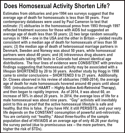 According to a study by the institute for the Scientific Investigation of Sexuality in Lincoln, Nebraska, homosexual men, when compared to heterosexual males, are 14 times more apt to have ever had SYPHILIS, eight times more apt to have had HEPATITIS, and three times more likely to have had GONORRHEA, GENITAL WARTS or LICE. Homosexual women were also found to have had a higher incidence of disease when compared to heterosexual women (p.7, The New American, Jan.19, 1987). Also, "With only 4% of the adult population, sodomites account for 71% of AIDS fatalities, 49% of all SYPHILIS, 51% of THROAT GONORRHEA and 53% of INTESTINAL INFECTIONS" in the United States. The average homosexual male may have more than 1,600 "partners" during his active sex life. This is one reason for the rampant growth of AIDS among homosexuals (pp.264-265, Biblical Principles). "Currently, in most urban areas of the United States, over half of the reported cases of INFECTIOUS SYPHILIS occur in homosexual men" (The AIDS and Infections of Homosexual Men, 1984).