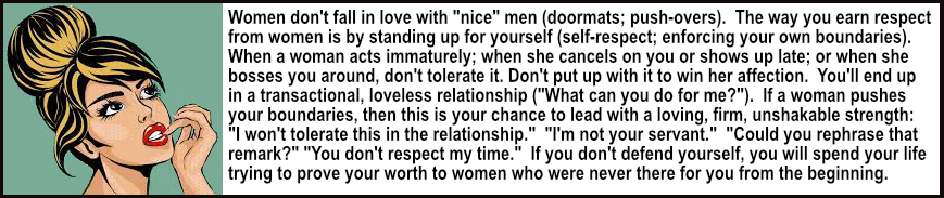 MEN derive SELF-ESTEEM by being RESPECTED and ADMIRED. WOMEN feel WORTHY when they are shown AFFECTION. Women need more than a surface relationship or business relationship. But men just need RESPECT. Women must have something more meaningful in the relationship -- romance, appreciation and love. Women hate the quiet, silent type. Women want to build intimate, loving, personal relationships with their husbands. Most women are love-starved. Their husbands drive them crazy by treating them merely as business partners and nothing more. Women become isolated and depressed. The husband must become romantic and let his wife know she is his sweetheart. The husband has a responsibility to take time out to "cheer up his wife which he hath taken" (Deut.24:5). Men must make their wives feel needed and important. This is the man's responsibility as the head of the house (pp.64-65, Dobson's What Wives Wish Their Husbands Knew About Women). Yes, "a man must love his wife as a part of himself; and the wife must see to it that she deeply respects her husband, obeying, praising and honoring him" (Eph.5:33). The wife must respect her husband for what he is right now -- not for what she wants him to become. Too many wives try to pressure their husbands to greater achievements rather than respecting what they already are. Honest admiration is a great motivator for most men. When a woman tells a man she thinks he's wonderful, that inspires him to achieve more. A man expects -- and needs -- his wife to be his most enthusiastic fan. She must follow him, obey him, honor and respect him. She must LET HIM BE HER TEACHER AND GUIDE -- even if he is wrong (1 Pet.3:1-7); but not if he disobeys God (Acts 5:29). Administrative, not doctrinal, errors. Wives must at all costs AVOID EMBARRASSING their husbands. Rather than trying to outdo them, smart women show respect by ACTING IGNORANT AND HELPLESS so the man can take the lead and control. Wives who support and encourage their husbands will bring out the best potential in them and spark their genius. "Behind every great man is a great woman." A man thrives on a woman's admiration. It builds his confidence. Overflowing respect for him that HIDES HIS MISTAKES is ideal. An environment of nagging and criticism is dangerous to his mental health (pp.150-160, His Needs, Her Needs by Harley).