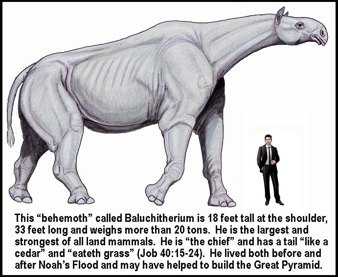 "He is THE CHIEF of the ways of God: He [alone] that made him can make his sword to approach unto him" (Job 40:19). This rules out the hippopotamus, the elephant, or other creatures men have taken into captivity or killed. It must have been the LARGEST and STRONGEST land animal God made for man's world. The discovery of fossil Baluchitherium fits all these characteristics, as well as the other characteristics of this HUGE animal as described in Job 40:15-24. "The LARGEST MAMMAL that ever lived on land was the Baluchitherium, which stood 18 ft. high at the shoulders. Remains of the animal were first discovered in 1911 by C. Forster-Cooper of the British Museum" (The New Yorker Aug. 14, 1971, p.39).