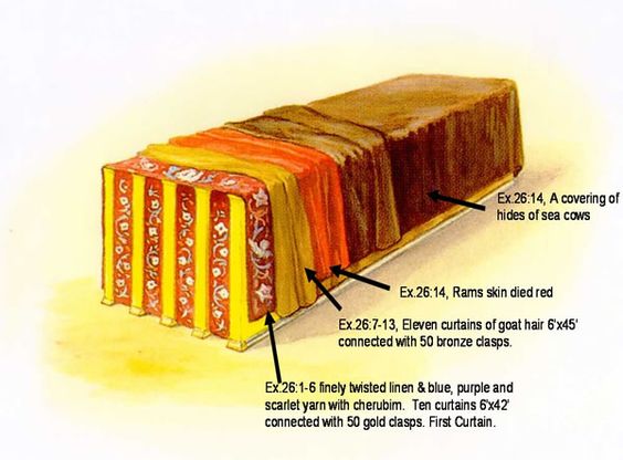 There are a few other points to ponder as you look at this image. First of all, you'll notice the reddish-blueish covering that is coupled together with 50 golden clasps. God commanded Moses to create three coverings for the Tabernacle. The first covering was made of red, blue, and purple material with interwoven linen. It consisted of two sets of "curtains", each containing five strips of fabric sewn together. The two five-piece curtains became one ten-piece curtain when they were coupled together with the golden clasps, just in front of the Holy of Holies. Could these seams and openings indicate the torn and battered flesh of Jesus Christ? His body beaten blue and purple and bloody red?
