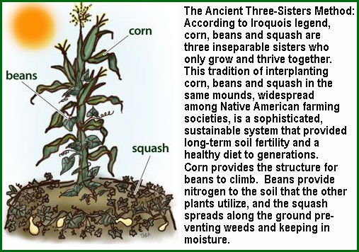 at one height. Everything competes for the same sunlight at the same level. The "Three Sisters" uses three dimensions. CORN captures high sunlight. BEANS climb the middle zone accessing sunlight between CORN plants. SQUASH spreads horizontally at ground level using sunlight that makes it to the bottom. This vertical stacking means more photosynthesis per square foot, more leaf surface area capturing solar energy, more plant biomass produced from the same ground space. Its dramatically more efficient than monoculture. It utilizes vertical space.