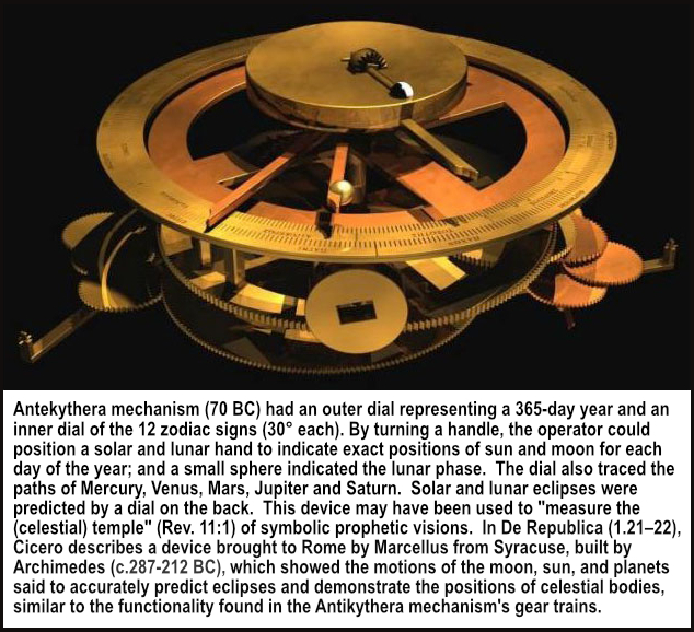 When they sinned, a "lamb" was "slain" (Rev. 13:8) to provide them each with "a robe of righteousness" (Isa. 61:10) to cover their nakedness (sin -- Rev. 3:18). That was the Gospel message at the very beginning. Humans and animals were vegetarian (Gen. 1:29-31; cp. Isa. 11:7 & 65:11). "Spring was forever ... earth, unplowed, brought forth rich grain" (Ovid Metam. 1:108) from pole to pole. Men lived to be nearly 1000 years old (Gen. 5:27) due to a water vapor canopy which protected earth's inhabitants from harmful cosmic rays and ultraviolet radiation, so the aging process was much slower. It will be that way again in the Millenium (Isa. 65:22). The planet Venus is shielded by vapor canopy so dense we can't see the surface of Venus. Saturn's moon, Titan, also has vapor canopies surrounding it. At one hundred years, a man was still a child (Hesiod Works and Days 109). Plants and animals grew larger than they do today (Gen. 6:4). It was also like a giant hyperbaric chamber. According to Time magazine, when analyzed in a vacuum chamber, the oxygen content of encased air bubbles in ancient amber (fossilized tree sap) is 50% higher than the atmosphere is now (Time magazine Nov. 9, 1987, p.82). In a hyperbaric chamber, cuts healed quickly. Furthermore, the sun and moon were in synchronization. Twelve 30-day months coincided with a 360-day year (Augustin de Trin 4:4). No remainder. In short, "it was very good" (Gen. 1:31). There was no rain. Instead, a "mist went up from the ground and watered" the plants (Gen. 2:4-6; Job 38:4,9). Noah is praised for believing a warning about rain -- something "not seen as yet" (Heb. 11:7). Rainbows also were first seen at the time of the Flood (Gen. 9:13-16). But the rest of the people "could not abstain from mutually inflicting violence on eachother, nor would they worship the immortals, nor sacrifice to the blessed ones on their altars. Therefore Zeus (in Latin Jove, which is short for Jehovah) removed them, because they would not give honor to the blessed gods who inhabit Olympus" (Hesiod, Works and Days, v.126-128). Each cherub came to be called a sphinx, the Garden of Eden was renamed the Garden of the Hesperides, and the fruit became golden apples. How long did Adam and Eve live in this Paradise of hedonism (Eden = Greek Hedon = Pleasure, Joy)? Since tradition labels it a "Golden Age", we believe it was longer than a day, or a week, or a year. A more likely guess would be 100 years to qualify as an "Age." Since Cain was born after the expulsion (Gen. 4:1), and murdered Abel as an adult, who was then replaced by Seth who was born when Adam was 130 years old (Gen. 5:3), we believe 100 years is an outer limit for this "Golden Age." If the EARTH DIDN'T ROTATE on its axis at first, then a day would have been a year in length originally. At least during creation week. Hence the day-year symbolism found in the Bible (Num. 14:34; Ez. 4:6). When did the earth start SPINNING? Possibly after the Creation Week or after the Fall of Adam. If the circumference of our Earth globe at the equator is twenty four thousand miles (24,901), the surface of the Earth, to move round its own axis once in twenty four hours, must move at the rate of a thousand miles an hour.