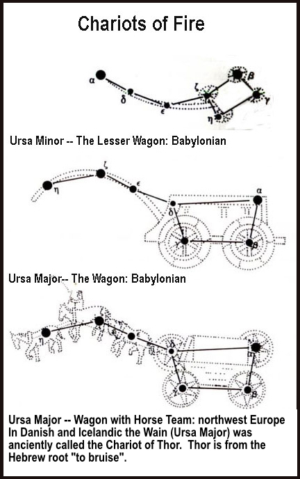Recall that Elijah was such a fast marathon RUNNER that he beat Ahab's chariot from Mt. Carmel to Jezreel -- 23 miles away. Each of these "Elijahs" may be like a "chariot of fire" (2 Ki. 2:11-12) since the sun forms the fiery WHEEL of Auriga's chariot at the same time it is a Greek OLYMPIC TORCH. "For, behold, the Lord will come with FIRE, and WITH HIS CHARIOTS like a whirlwind, to render his anger with fury, and his rebuke with flames of FIRE" (Isa. 66:15) -- Auriga with the star Capella -- the Charioteer with his chariot superimposed. Anciently Leo, Ursa Major and Ursa Minor were all given the chariot symbol as well. The stephanos (sun CROWN made of leaves of gold) was given to victors in the GREEK GAMES. The same word is used of the CROWN of life (James 1:12; 2 Tim. 4:8) and CROWN of thorns (Matt. 27:29). Astronomically, Orion's hand is lifted up to heaven as it holds an open book. In order to COME BACK with Christ, as CHARIOTS of FIRE, we must be resurrected and TAKEN AWAY with him first in a secret "rapture".